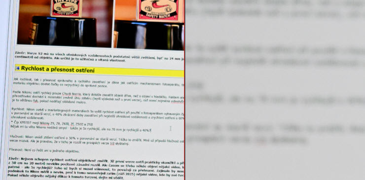 Přesnost: Není co řešit ani u jednoho objektivu. Závěr: Nejsem schopen rychlost ostření objektivně změřit. Již první verze ostří prakticky okamžitě a při přeostření z 50 cm na 20 metrů nevidím pocitově zásadní rozdíl. Ale časem se třeba někde objeví nějaké video, kde to bude patrné - ale 5x rychlejší? Toho už bych si musel všimnout, to považuji za přehnané. Zajímalo by mne, za jakých podmínek to Nikon měřil a nevím, proč k tomu neuveřejnil zatím (září 2025) nějaké video, kde by své tvrzení doložil. Pokud někde objevíte nějaký důkaz k tomuto tvrzení, dejte mi vědět.
